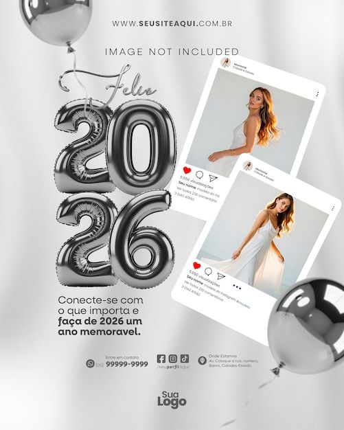 Bài đăng mạng xã hội chúc mừng năm mới 2026 với bóng bay màu bạc.