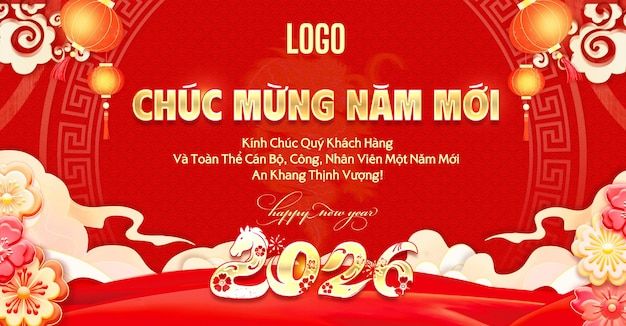 Banner Tết Việt Nam 2026 với thông điệp chúc mừng năm mới và chủ đề lễ hội màu đỏ.
