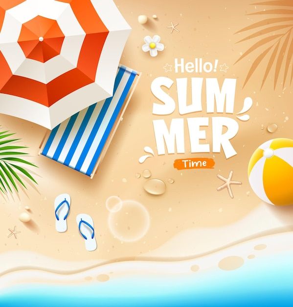 Beach umbrella and beach canvas bed coconut leaf beach ball summer poster design on sand beach