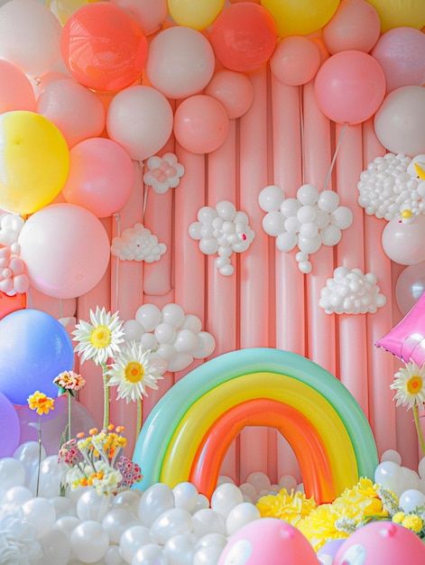 Birthday backdrop arrangement with vibrant colored balloons rainbow and clouds