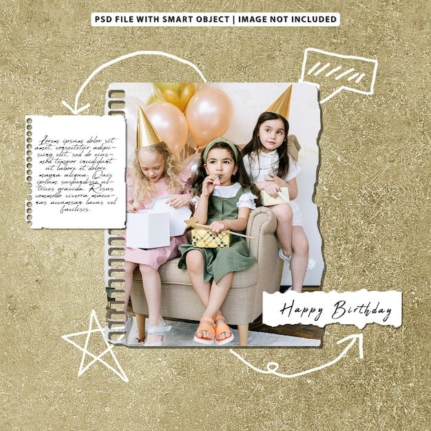 Birthday photo frame set mockup with hand drawn ornaments premium psd