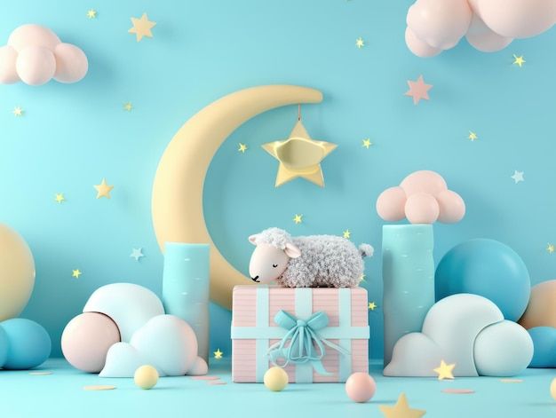 Scandinavian style white interior children’s room, bedroom, nursery. Baby cot with canopy. Wooden shelves and toys. Canopy tent, textile kite and balloons