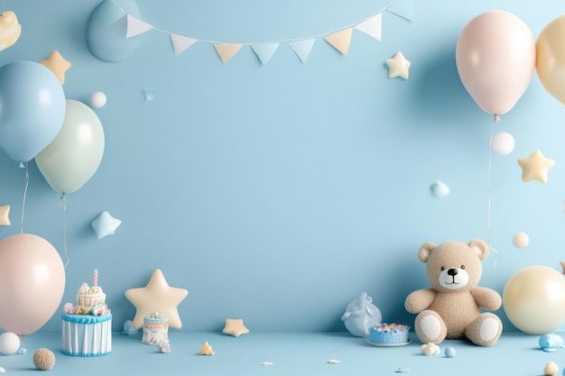 Scandinavian style white interior children’s room, bedroom, nursery. Baby cot with canopy. Wooden shelves and toys. Canopy tent, textile kite and balloons
