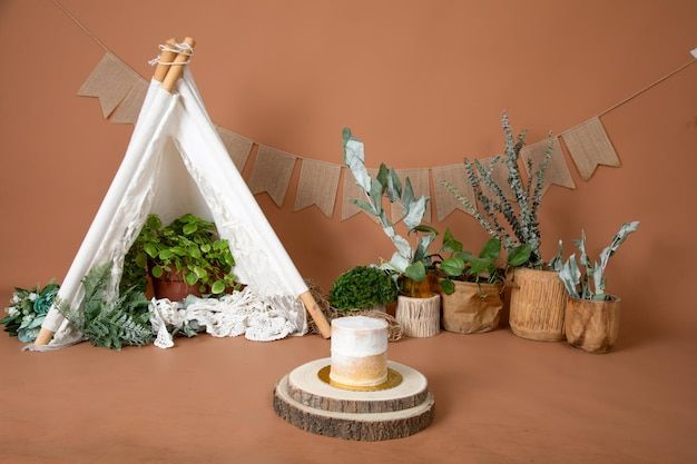 Scandinavian style white interior children’s room, bedroom, nursery. Baby cot with canopy. Wooden shelves and toys. Canopy tent, textile kite and balloons