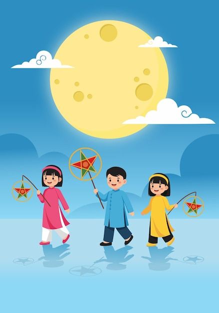 Children with lanterns under the full moon celebrating mid-autumn festival