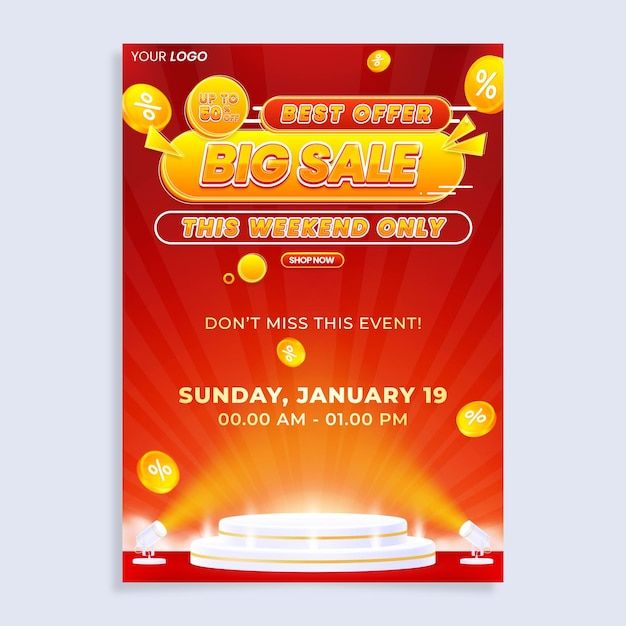 Colorful big sale vertical poster flyer design template with podium
