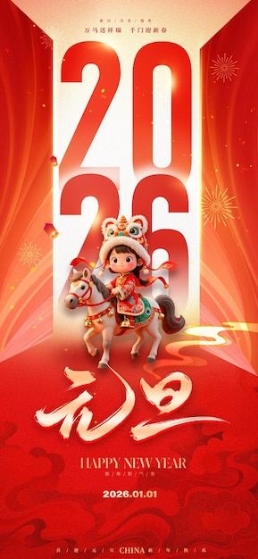 Lời chúc năm mới 2026 rộn ràng với nhân vật dễ thương cưỡi ngựa.