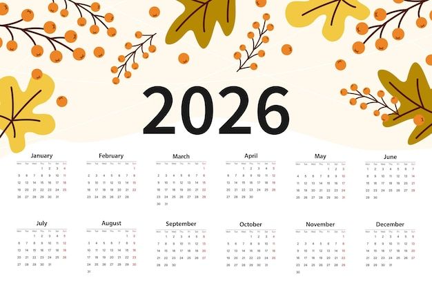 Mẫu lịch năm 2026 trên nền màu be trang trí bằng lá cây.