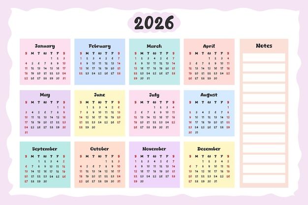 Mẫu lịch tối giản cho năm 2026, tuần bắt đầu từ Chủ nhật.