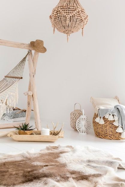 Scandinavian style white interior children’s room, bedroom, nursery. Baby cot with canopy. Wooden shelves and toys. Canopy tent, textile kite and balloons