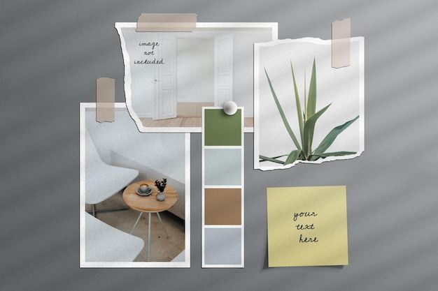Mockup of wall mood board with ripped paper photo card collage set palette scene creator isolated