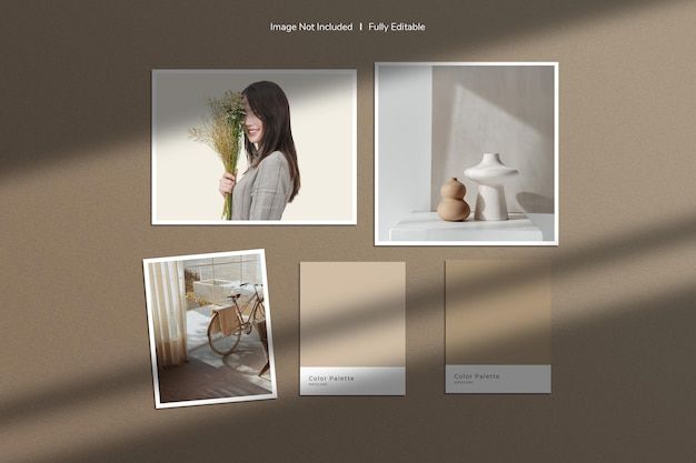 Paper frame photo and mood board scene creator mockup with shadow overlay and color palette