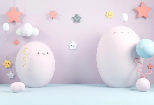 Pastelcolored cartoon clouds and stars on a pink background with space for text