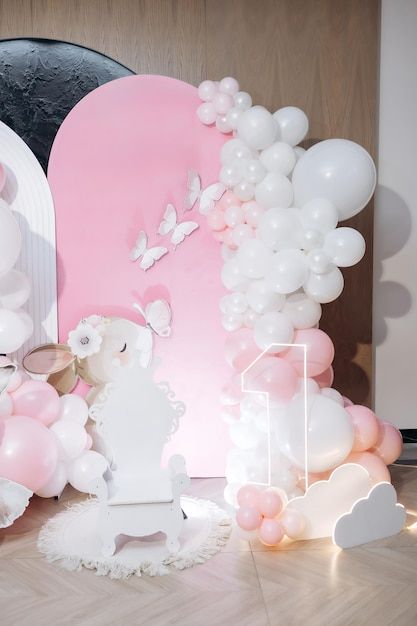 Pink photo zone for childrens birthday with helium white balloons bright celebration of childrens birthday with blue balloons