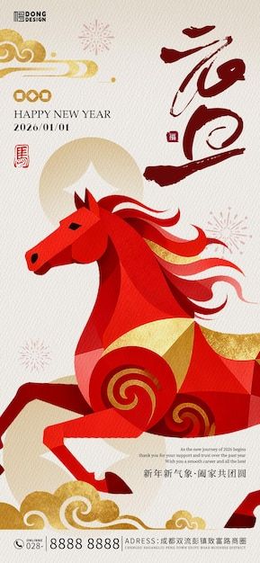 Poster chúc mừng năm mới 2026 với ngựa đỏ rực rỡ.