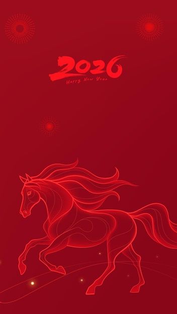 Poster chúc mừng năm mới nền đỏ với minh họa năm Ngựa dạng xếp lớp.