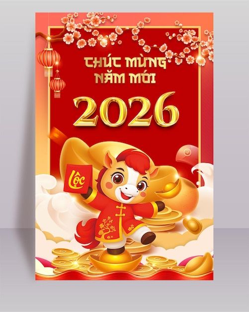 Poster Tết Nguyên Đán Việt Nam 2026 với đồng tiền vàng và nhân vật ngựa hoàng đạo.