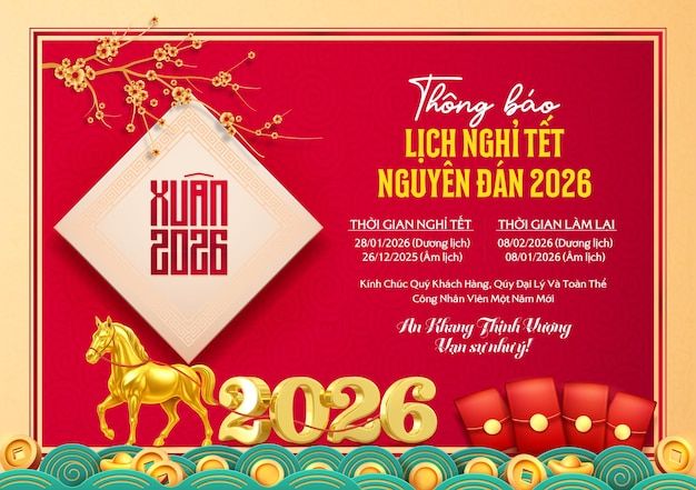 Poster thông báo nghỉ Tết 2026 với tông màu đỏ.