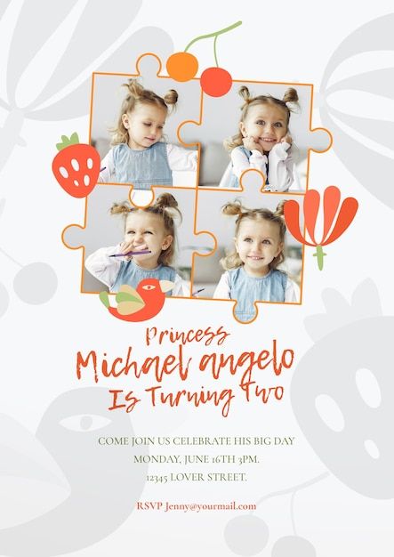 Puzzle photo frame with floral and fruit doodle clipart birthday invitation