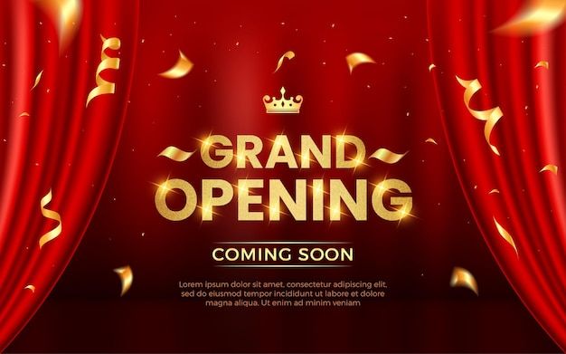 Realistic grand opening invitation banner with red curtains golden elements and 3d editable text effect