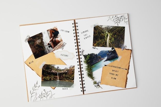 Scrapbook with travel photos flat lay