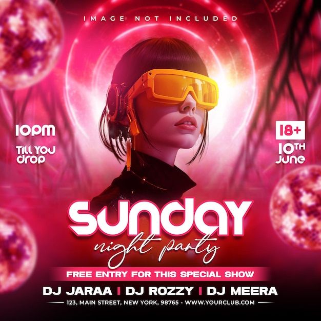Vibrant futuristic night party flyer with dj lineup