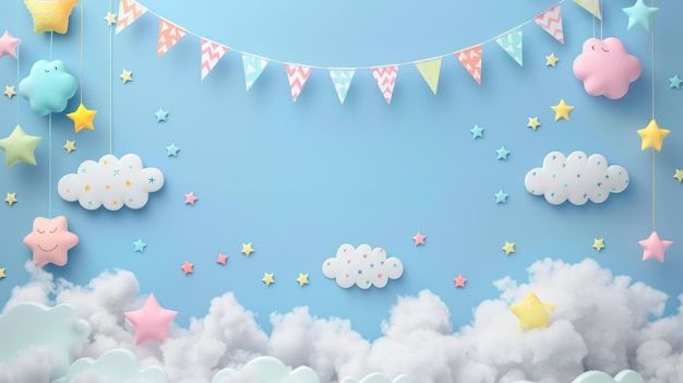 Whimsical children s room background featuring colorful clouds stars and pennant flags on a soft